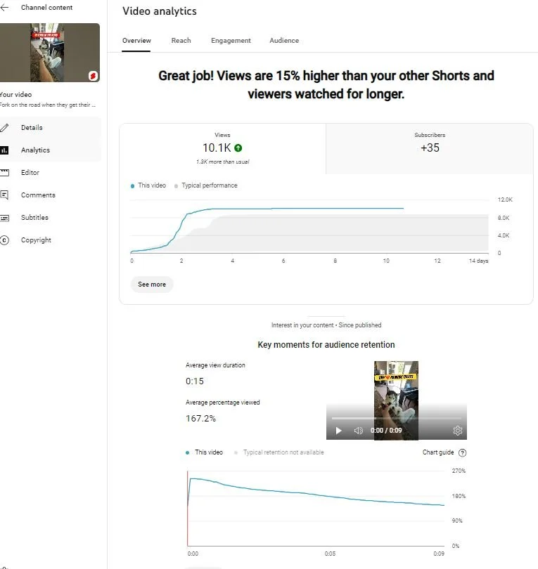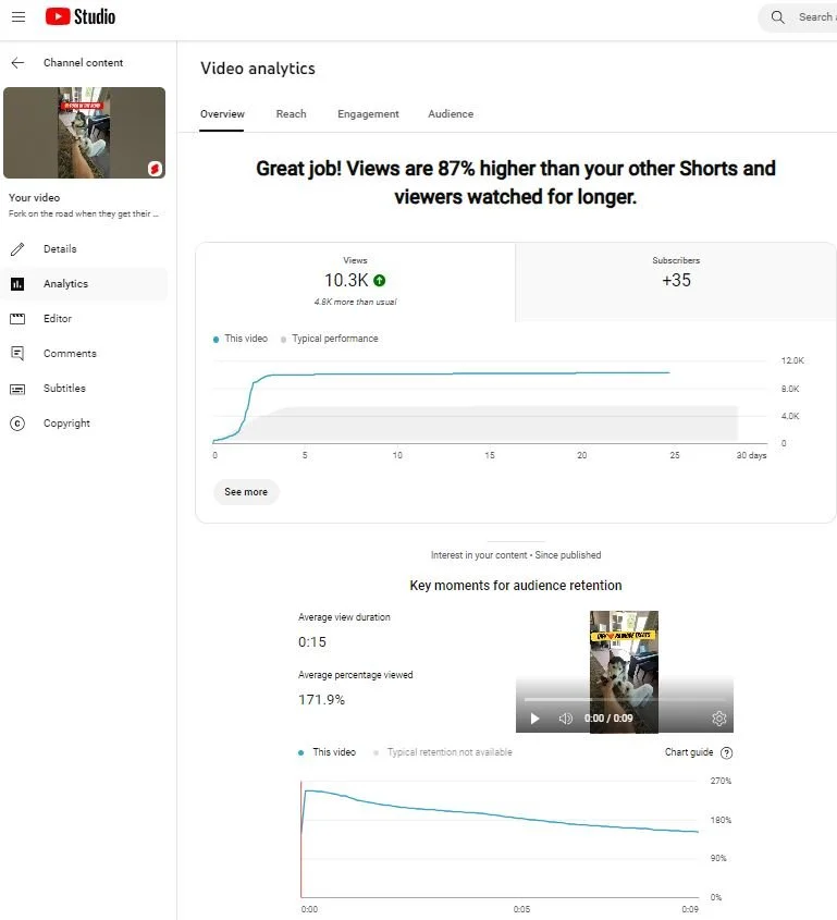 Our engagement is 300% higher than ANY dog channel 10,000 - 50,000 subs: subscribers per day, shorts views, comments, likes, and shares. Don’t believe us? Check the analytics: