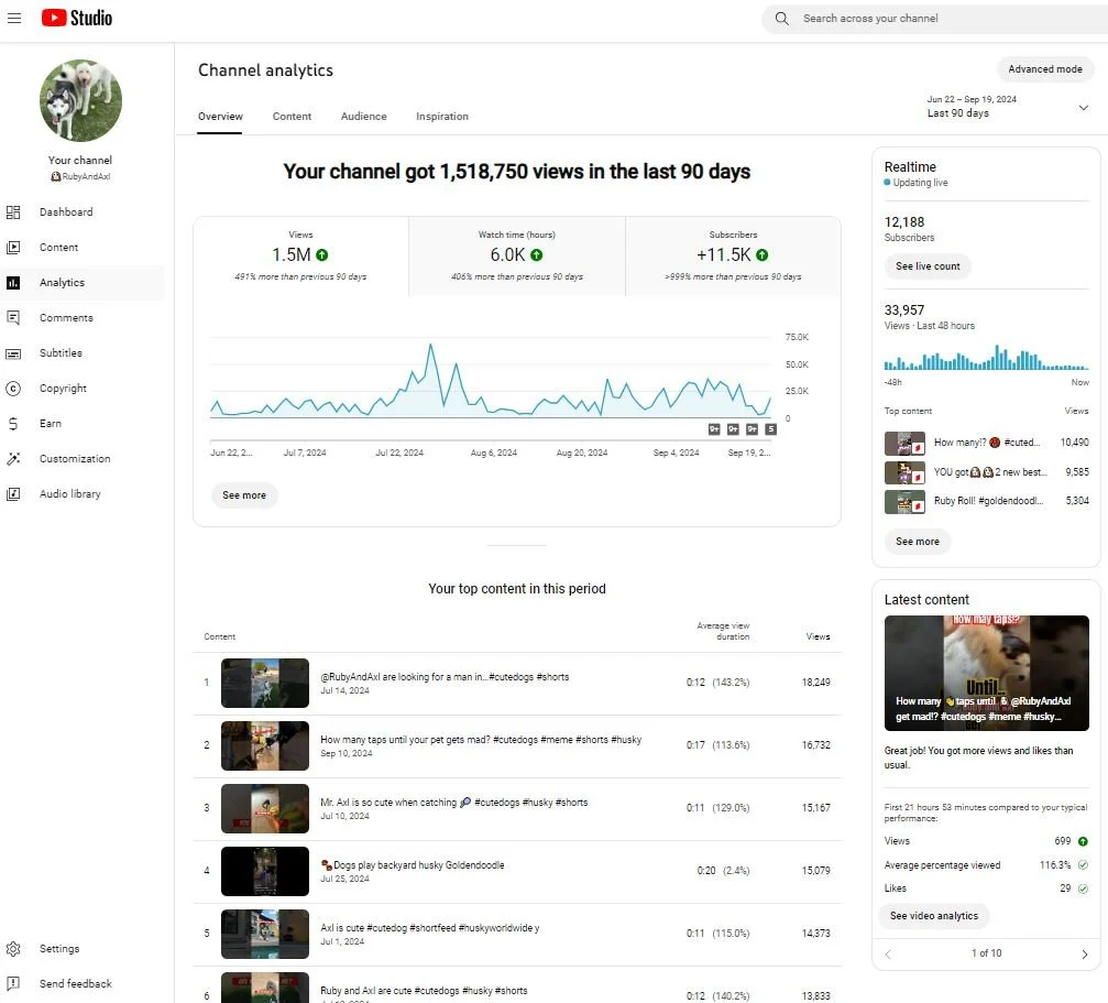 We are the fastest growing small dog channel on YouTube. We went from 0 to 12,000 subscribers in 90 days. Here are the analytics to prove it: