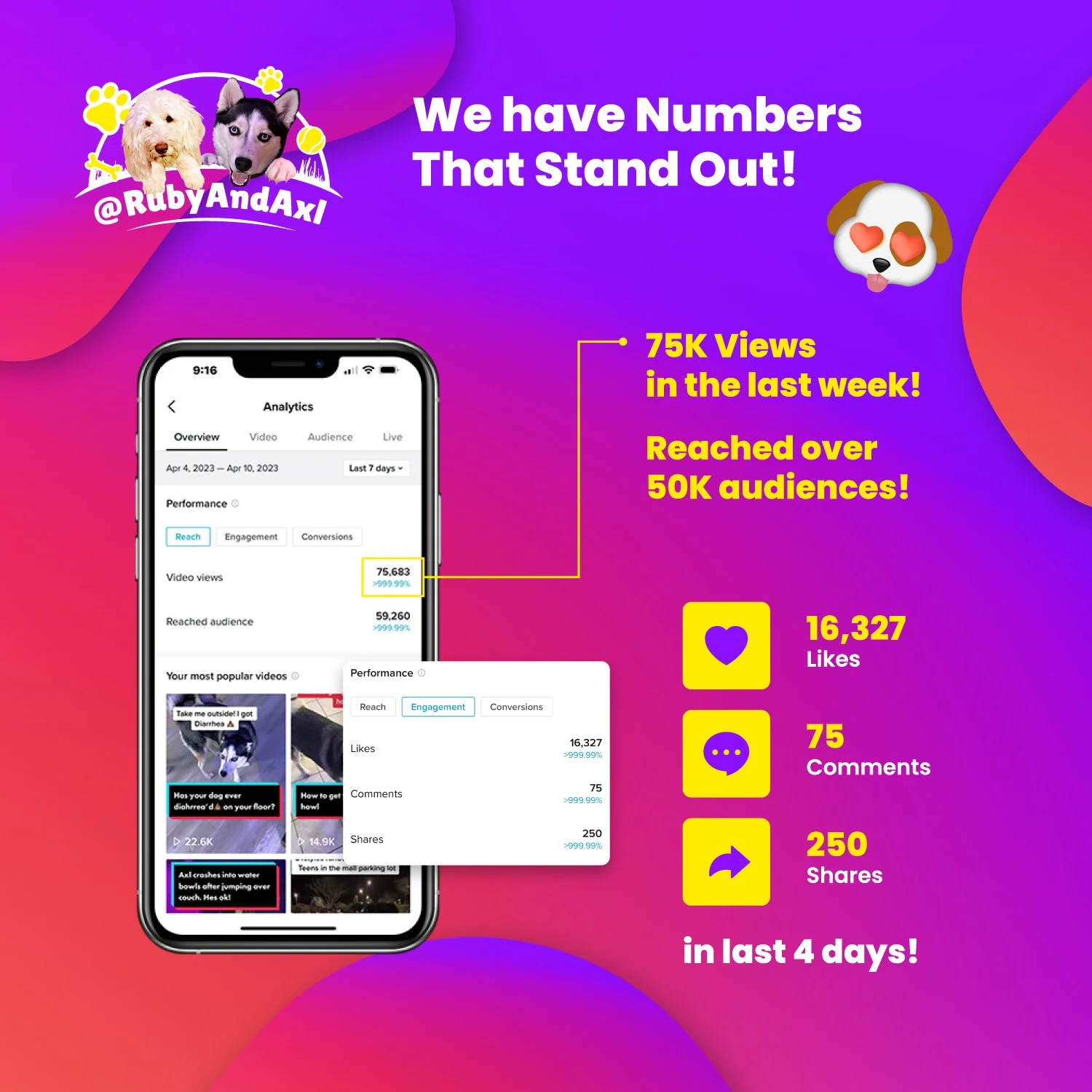 The numbers speak for themselves - Ruby and Axl are taking the dog influencer world by storm. Brands are clamoring to collaborate with us, and our community is growing by the day. This is just the beginning for our dynamic duo!